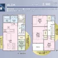 | 設備・条件 | ガスコンロ 三口コンロ システムキッチン カウンターキッチン 給湯 洗髪洗面化粧台 シャワー 浴室乾燥機 ユニットバス バス・トイレ別 温水洗浄便座 床下収納 TVドアホン プロパンガス 公営水道 排水下水 駐車場有 バルコニー 建築確認番号:第R06SHC124089号 ※フラット35S利用可(別途費用88000) ※宅地内に電柱及び支線が入る場合があります。 ※司法書士は当社指定となります。 ※全棟が長期優良住宅対象物件です。