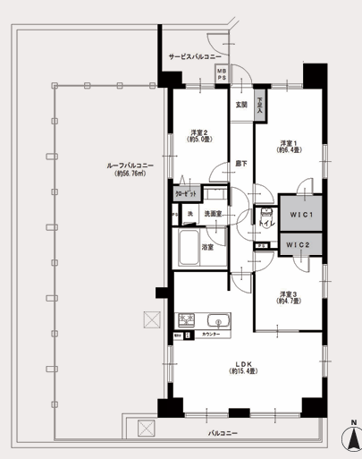LDK15.4畳 洋室6.4畳 洋室5.0畳 洋室4.7畳 |