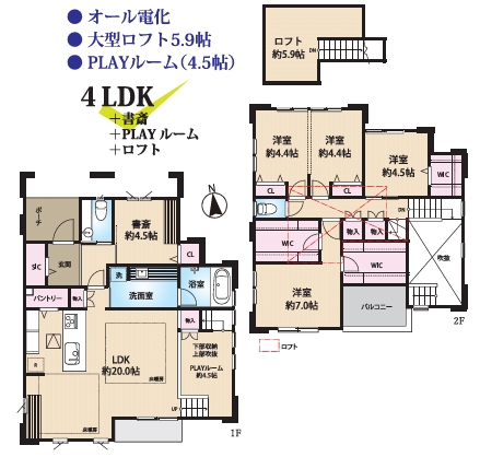 LDK20.0畳 1階 その他4.5畳 1階 その他4.5畳 洋室7.0畳 洋室4.5畳 洋室4.4畳 洋室4.4畳 書斎+PLAYルーム+ロフト |
