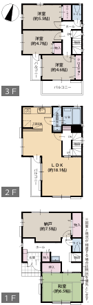 和室6.5畳 1階 S7.5畳 1階 LDK18.1畳 2階 洋室5.5畳 3階 洋室4.7畳 3階 洋室4.6畳 3階 |