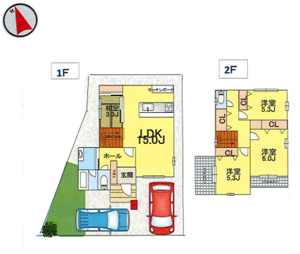 LDK15.0畳 1階 和室3.0畳 1階 洋室6.0畳 洋室5.3畳 洋室5.3畳 |